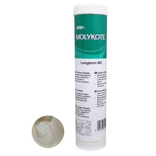 Molykote Longterm W2 Літиєве пластичне мастило з посиленою адгезією та антифреттинговими властивостями для підвищених навантажень і довготривалого змащування, підходить для високошвидкісних підшипників кочення.